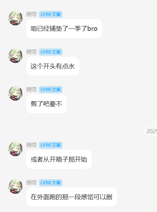 其实怎么说呢,这时候这个倒带还没意识到事情的严重性,只想着做着那b长视频(甚至5集+各种神秘小支线),不过具体就不说了,总之你们就只用知道之后倒带选择把原定的长视频(其实以现在的视角,原本的做法比现在烂太多了,但毕竟是远古代码重要想法么,还是得要说一下)改成现在的泡面小视频得了