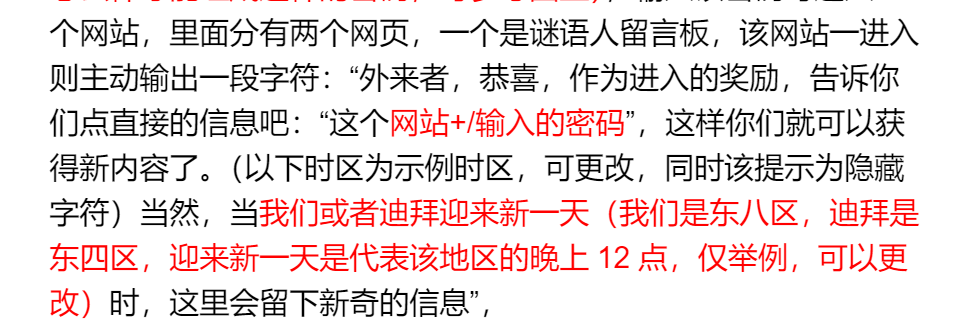 你们应该知道那个wordpuzzle(也就是字谜,不懂的自己去查)和密码页面吧(当然不知道的话我也不打算深入声明了),总之那个玩意就是第12谜题,那个想法其实就是有点借鉴明日方舟ARG(虽然明日方舟那个有点不像ARG,更像是puzzle,但还是能称得上是一个ARG)第一阶段(当然我没的),其实原本是有个真正意义上的redherring(红鲱鱼,简单理解成逻辑陷阱就行了)、真相(也就是那个幻梦计划)和一堆彩蛋(现在删了很多)
