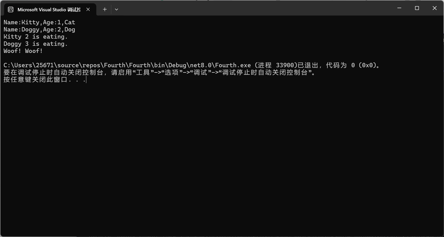 Console.WriteLine($"Name:{Name},Age:{Year},Cat");